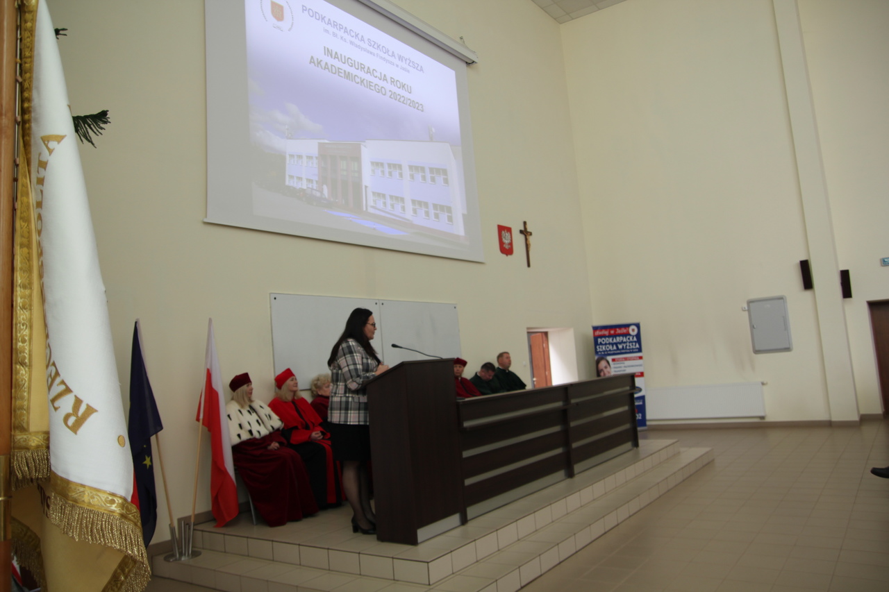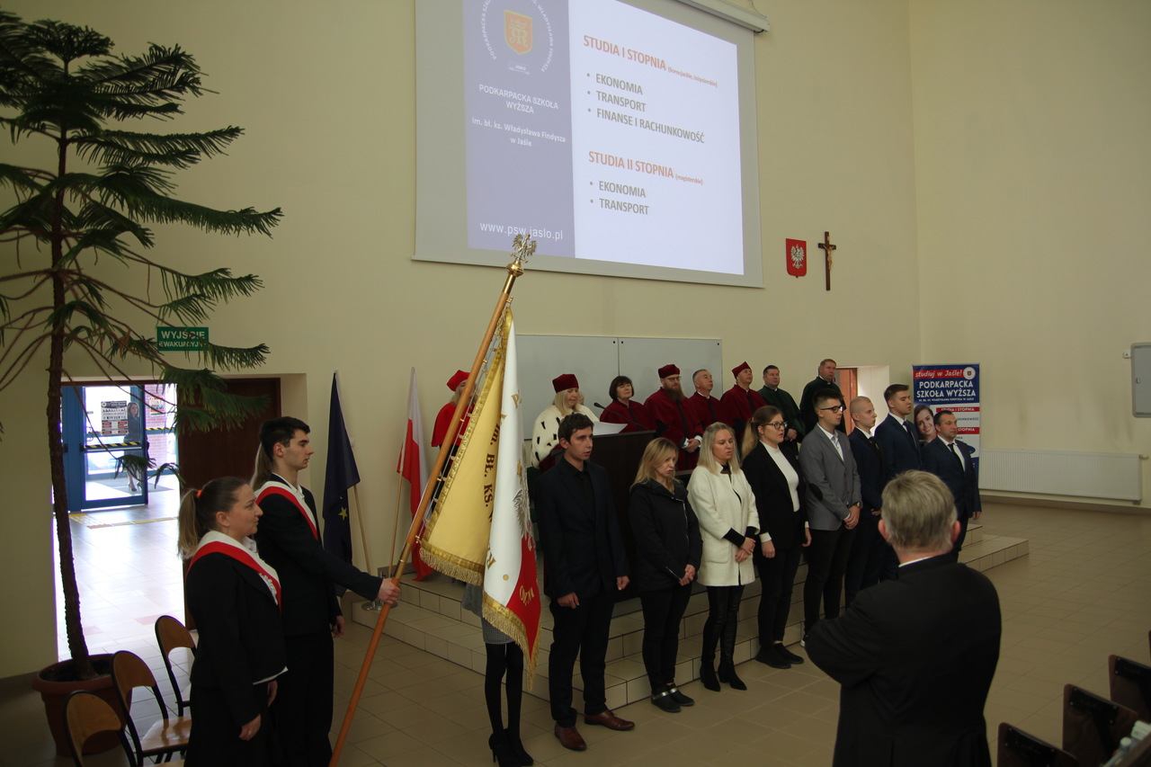 Po wprowadzeniu sztandaru i wysłuchaniu hymnu państwowego Jej Magnificencja dr Katarzyna Szajowska, Rektor Podkarpackiej Szkole Wyższej im. Bł. Ks. Władysława Findysza w Jaśle przywitała zgromadzonych gości.