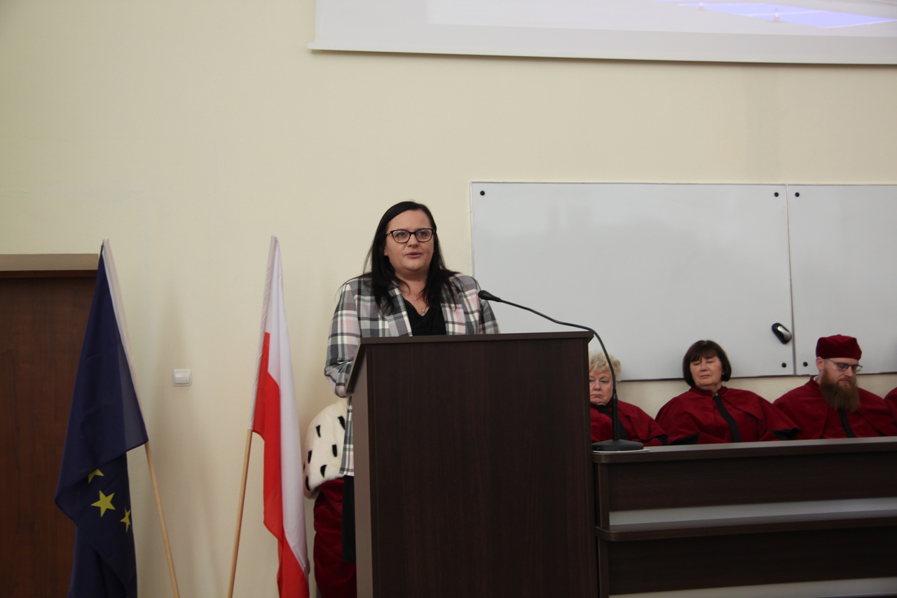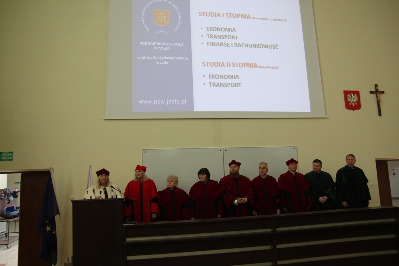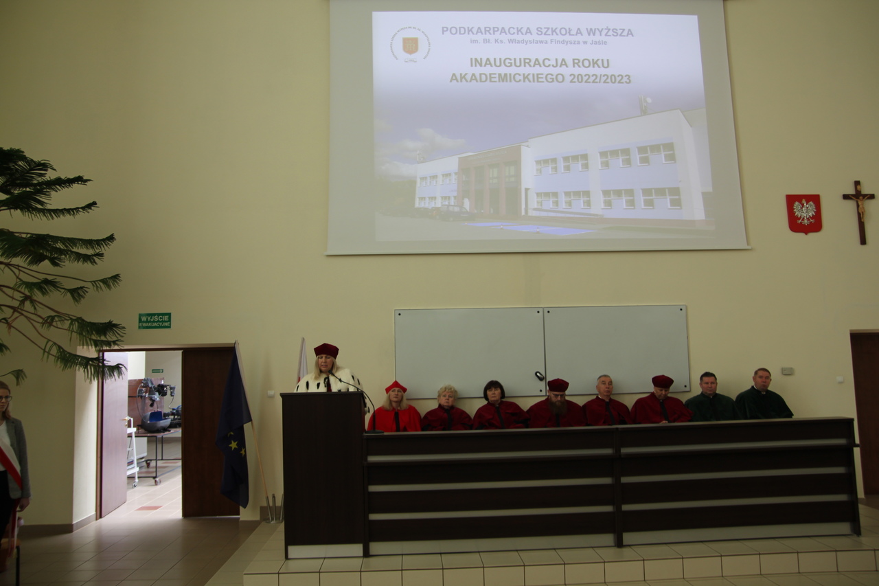 Po wprowadzeniu sztandaru i wysłuchaniu hymnu państwowego Jej Magnificencja dr Katarzyna Szajowska, Rektor Podkarpackiej Szkole Wyższej im. Bł. Ks. Władysława Findysza w Jaśle przywitała zgromadzonych gości.